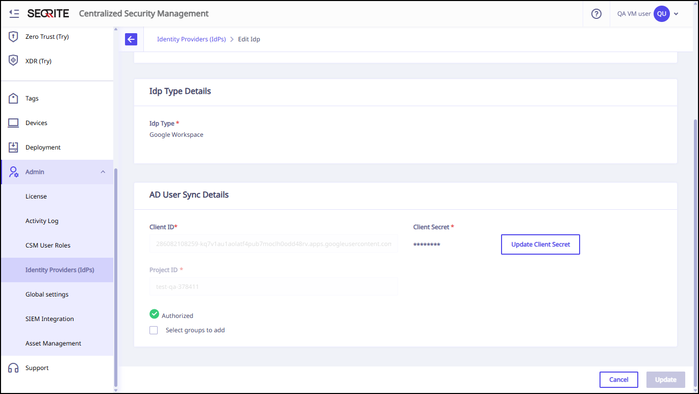 Note: The authorizing user must be an Admin with read access to Users, Groups, and Devices. These privileges are required to complete the IDP setup and ensure that user synchronization works correctly.
