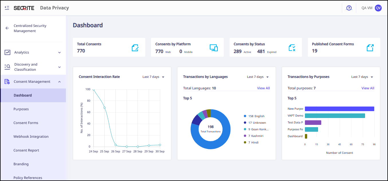 A Consent Management Dashboard with key metrics that give a clear, graphical overview of user consent activity.