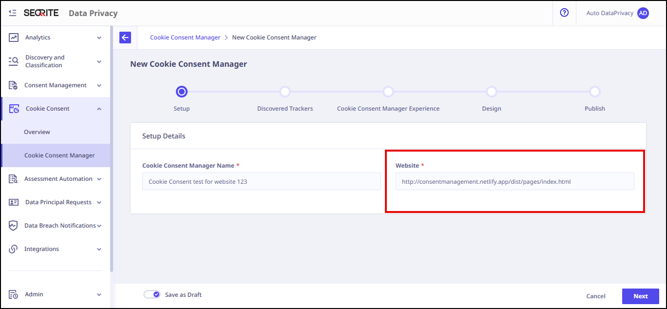 After clicking Add Cookie Consent Manager, the New Cookie Consent Manager screen appears with a progress