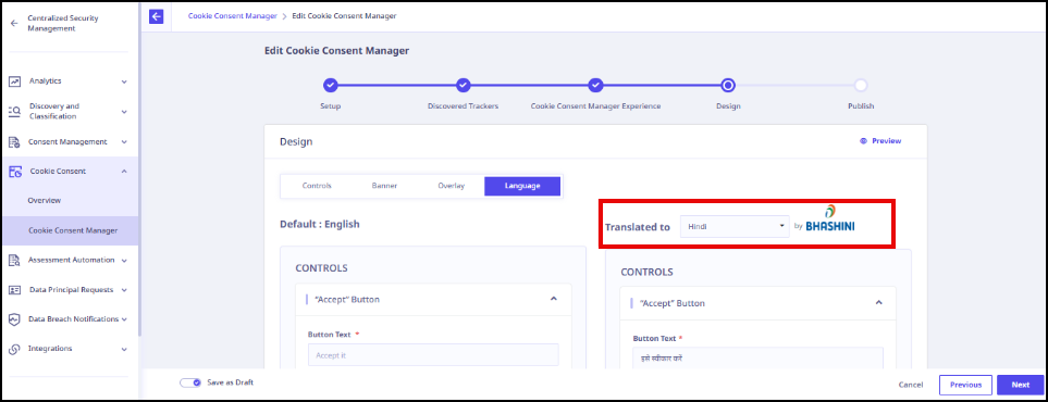 - In the Design phase, select the consent message design.