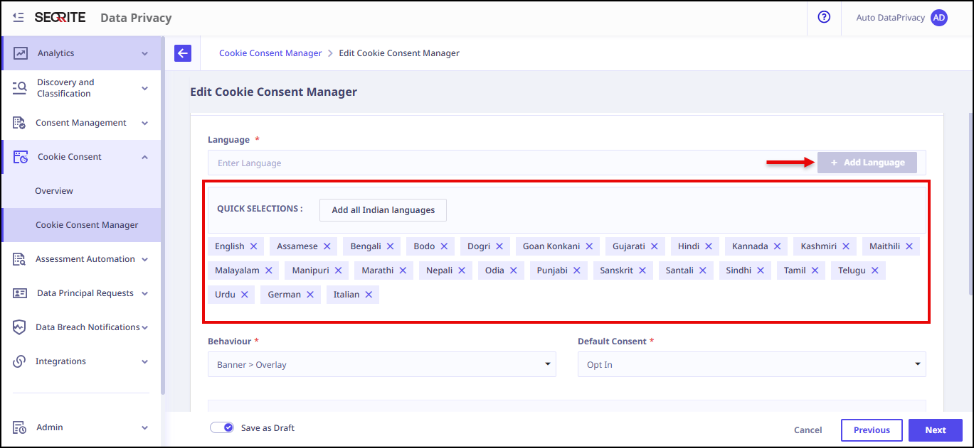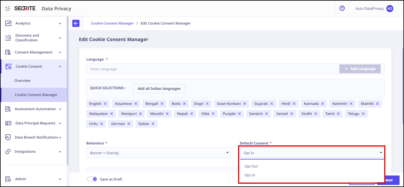 - Opt-in: For regimes (Such as DPDPA and GDPR) where cookies need to be disabled by default, choose Opt In.