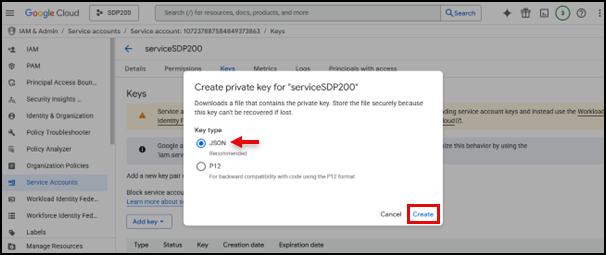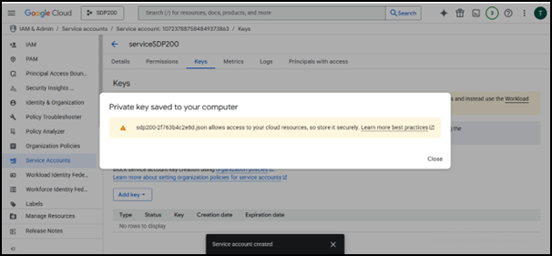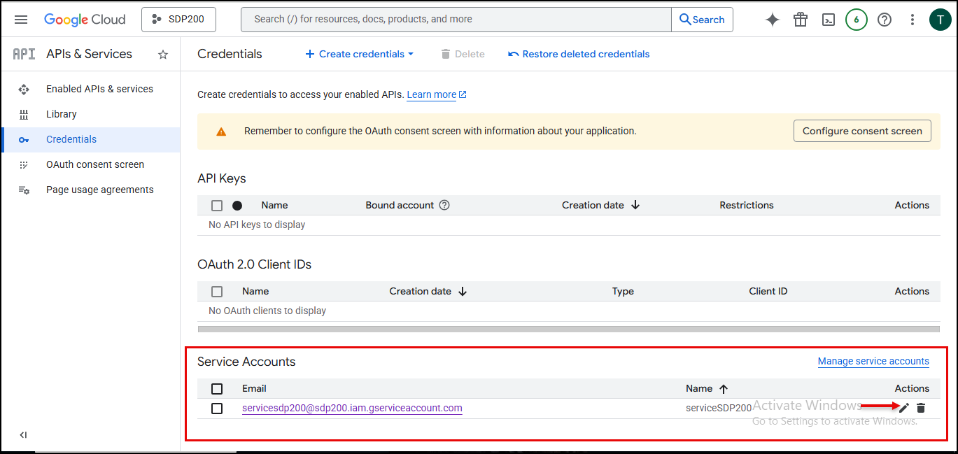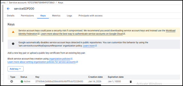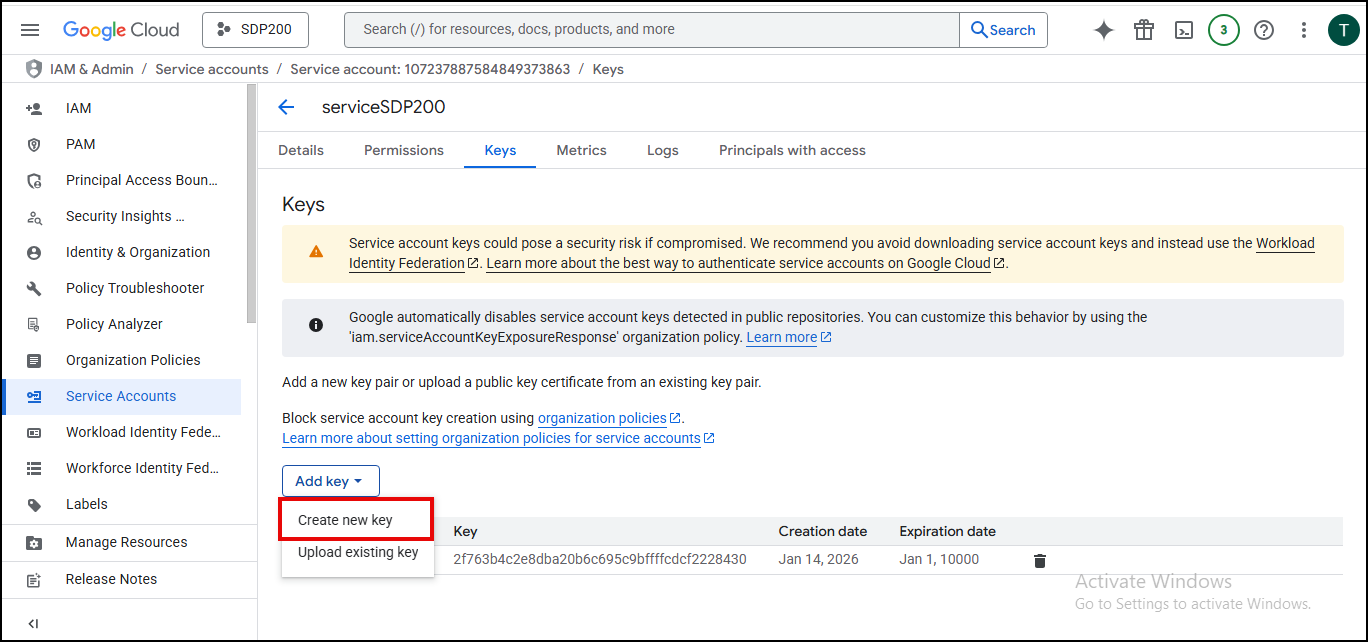 - Click Edit in the Service Accounts section and go to Keys tab.