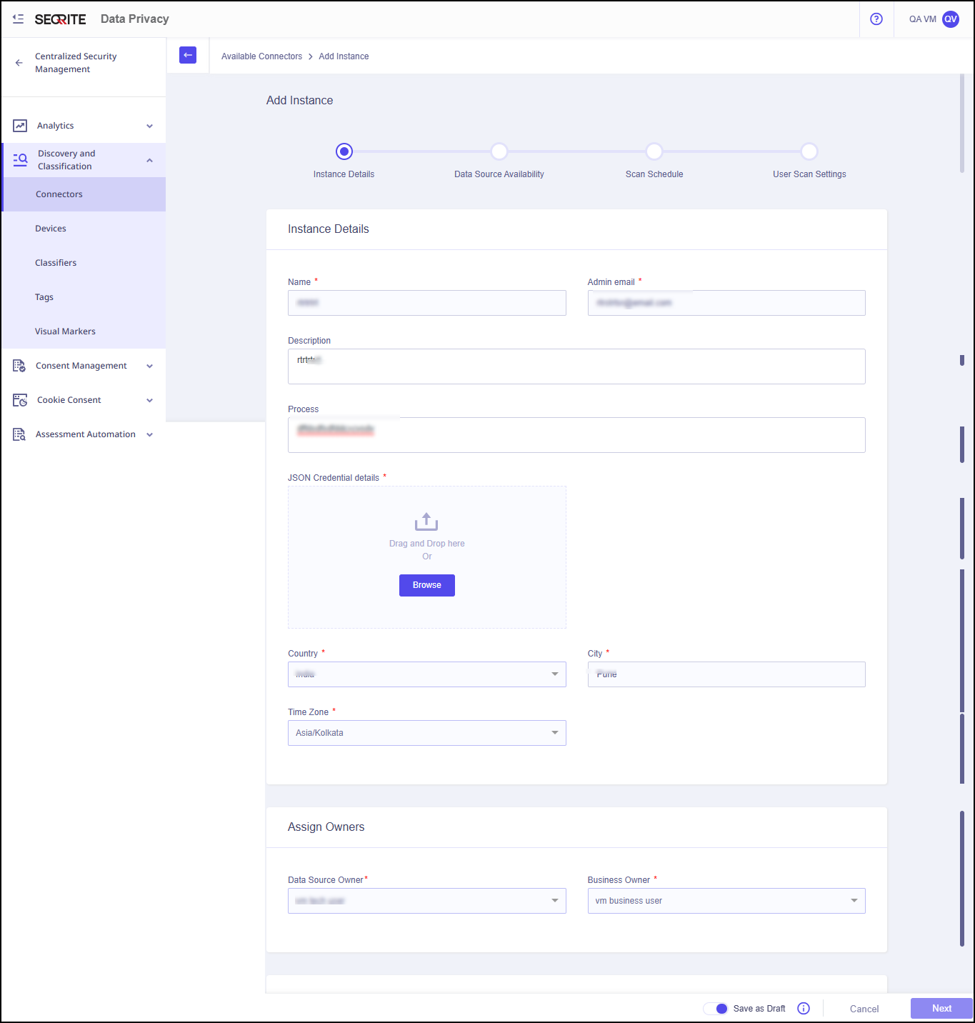 Note:The Json file downloaded from the Service Account needs to be added under the Json Credentials - Data Source Owner: The person who owns the data source and makes technical decisions about it.
