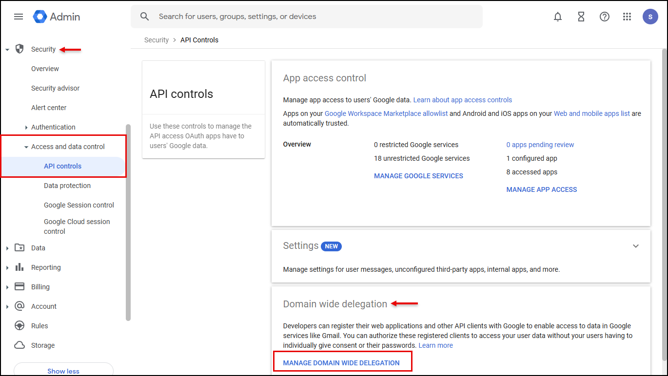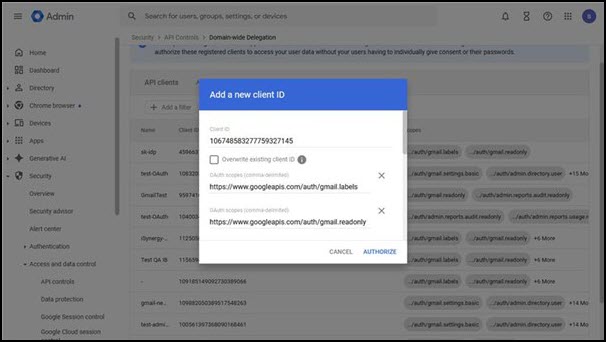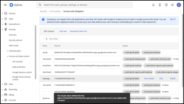 - Navigate to Google Domain wide Delegation.(https://admin.google.com/ac/owl/domainwidedelegation)