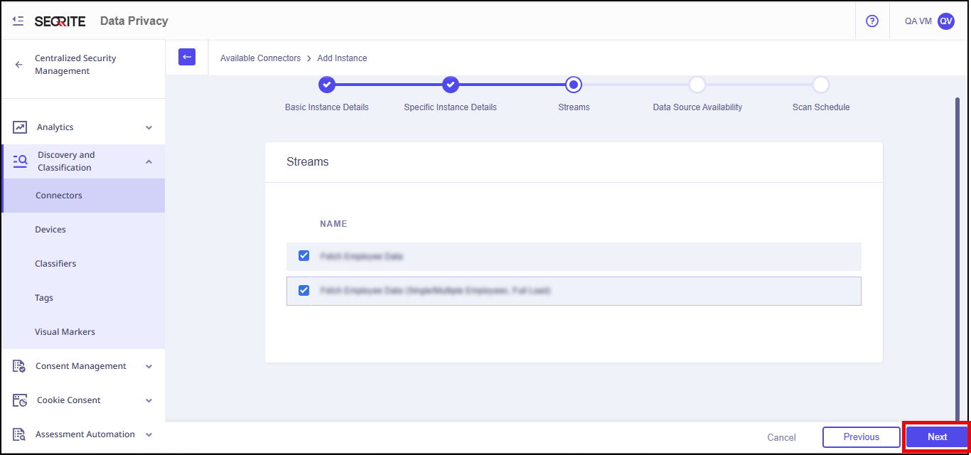 The Stream page displays all streams configured in the DarwinBox that require scanning. You can review the list and select the streams you need.