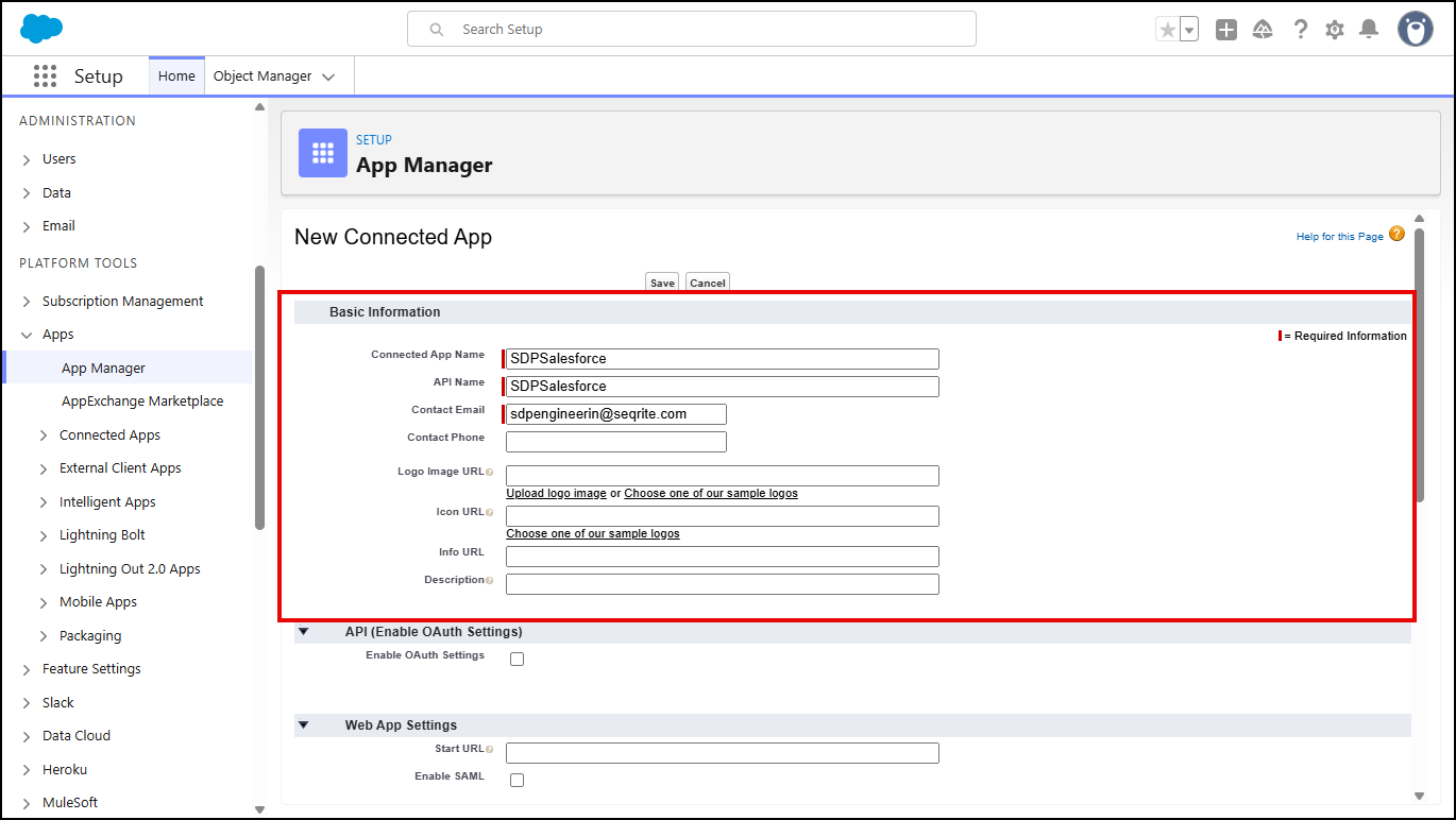 - In the New Connected App page, fill in the details.