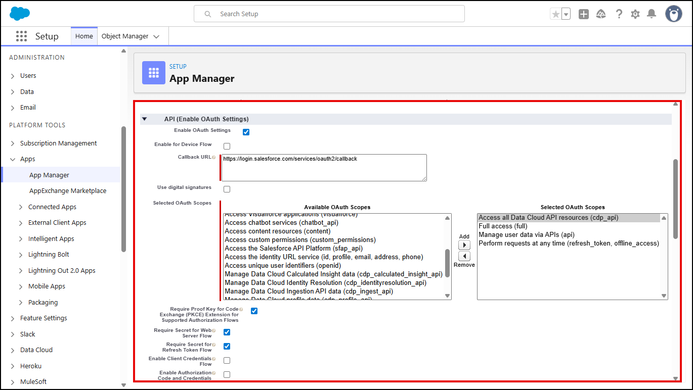 - Once the Connected App is saved, navigate to the page of your newly created connected application, and then locate the API (Enable OAuth Settings) section.