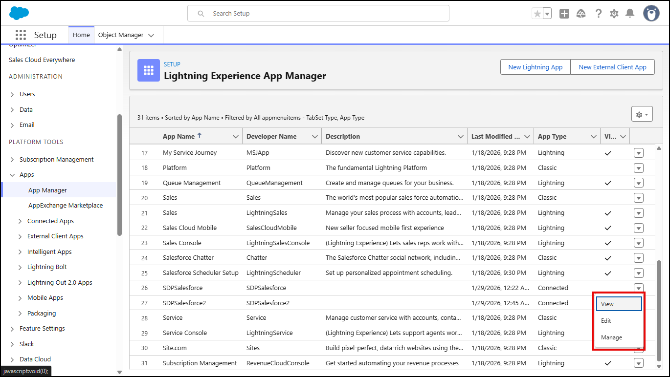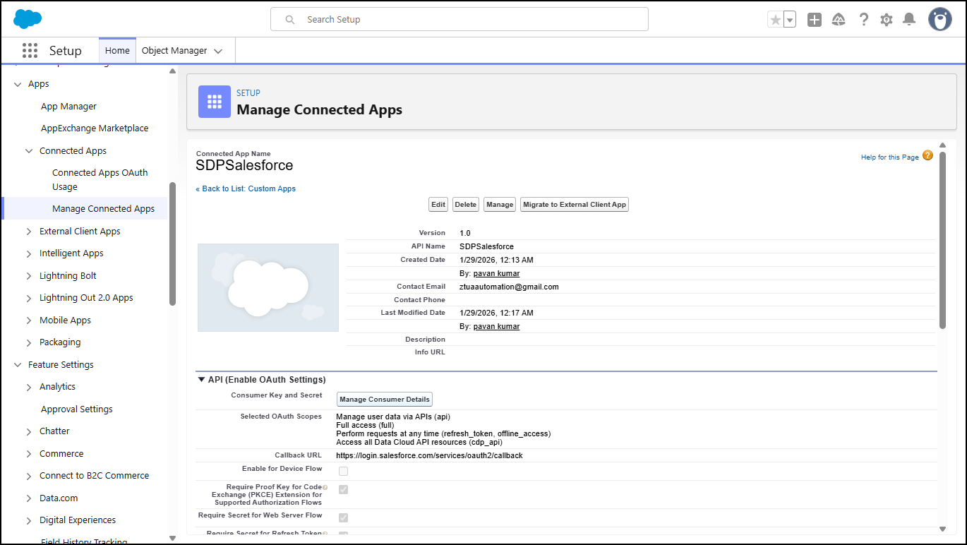 Note: To access Manage Consumer Details values in the future, go to: Setup >> Apps >> App Manager. Then click the name of the application in the Connected Apps list.