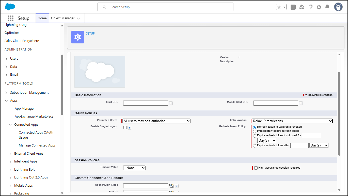 To add Salesforce instance as a connector in Seqrite Data Privacy, complete the following Connected App prerequisite step in Salesforce Admin console.