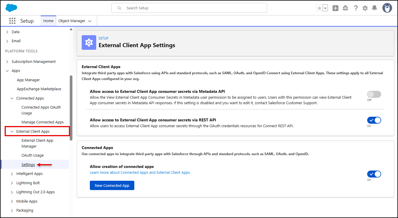 Note: If You are unable to create a Connected App, please make the sure the permission for creating Connected App is enabled in External Client App >> Settings.