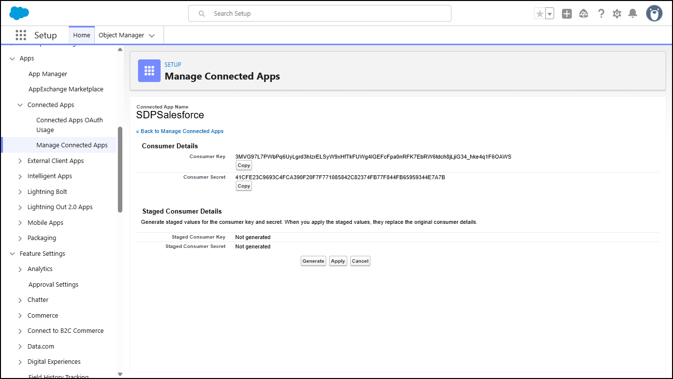 Note: To access Manage Consumer Details values in the future, go to: Setup >> Apps >> App Manager. Then click the name of the application in the Connected Apps list.
