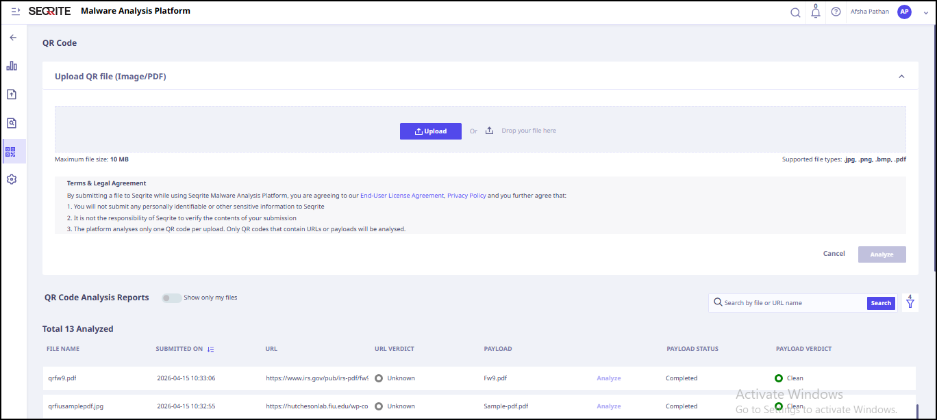 QR Code analysis within the Seqrite Malware Analysis Platform (SMAP) supports to detect malicious content embedded in QR codes. This feature will allow analysts to scan QR code data for threats such as phishing URLs, credential theft attempts, or links to malware-hosting sites.