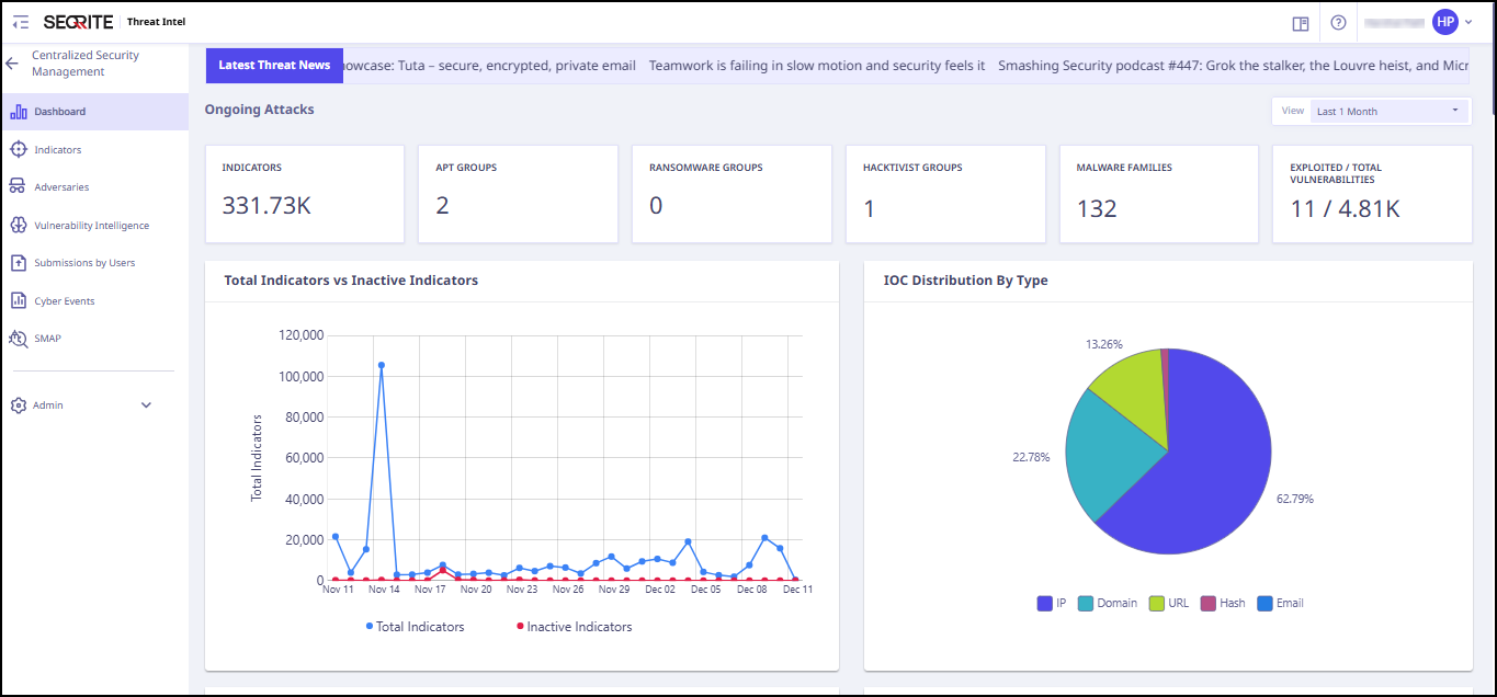 The dashboard is the default page that is displayed after you log on to the Seqrite Threat Intel portal. The dashboard helps to navigate easily to all the features or components of the Seqrite Threat Intel portal.