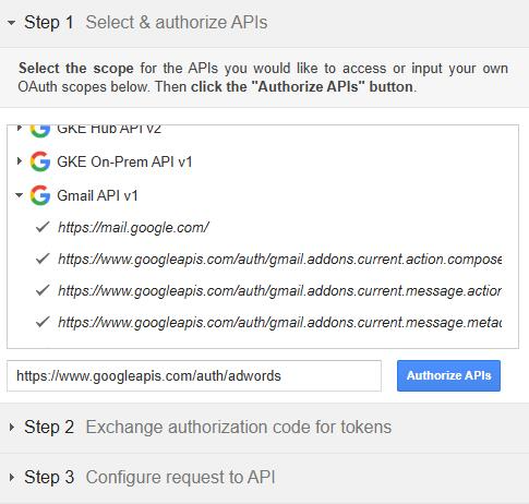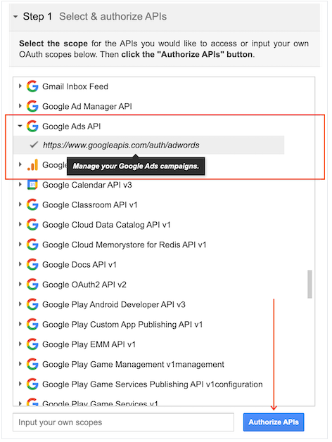- In the section labeled Step 1 – Select & authorize APIs, click Google Ads API from the list and select its scope, https://www.googleapis.com/auth/adwords. Then click Authorize APIs: