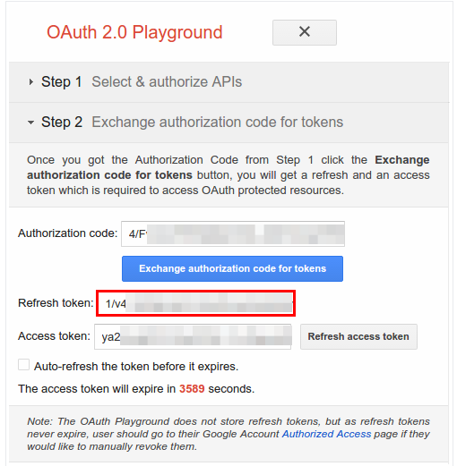 - If all goes well, the Refresh token and Access token should be filled in for you (you may have to re-expand Step 2 – Exchange authorization code for tokens):