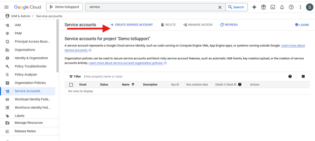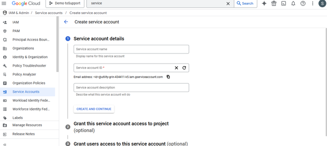 - In search bar, search for an service account. Click on create service account.