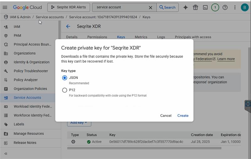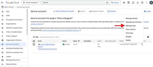 - Create Key for Service Account. On service account window.