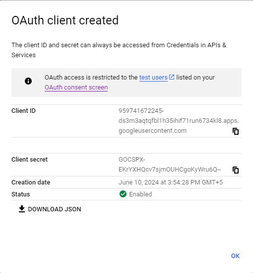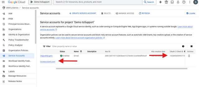 - Copy the Service account Email and OAuth 2 Client ID. This will require for the connector configuration.