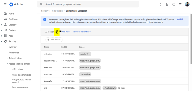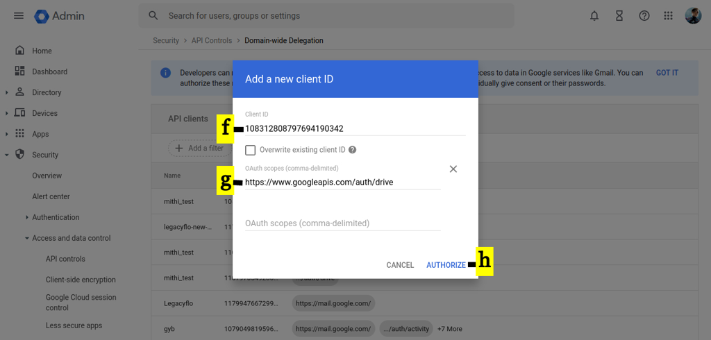 https://www.googleapis.com/auth/gmail.settings.basic,https://www.googleapis.com/auth/admin.directory.user,https://www.googleapis.com/auth/admin.directory.device.mobile.action,https://www.googleapis.com/auth/admin.directory.device.mobile.readonly,https://www.googleapis.com/auth/gmail.modify,https://www.googleapis.com/auth/gmail.settings.sharing,https://www.googleapis.com/auth/gmail.send,https://www.googleapis.com/auth/gmail.modify,https://www.googleapis.com/auth/admin.directory.device.chromeos,https://www.googleapis.com/auth/admin.directory.user.readonly,https://www.googleapis.com/auth/admin.directory.user.security,https://www.googleapis.com/auth/admin.directory.rolemanagement,https://www.googleapis.com/auth/admin.directory.rolemanagement.readonly,https://www.googleapis.com/auth/gmail.readonly,https://mail.google.com,https://www.googleapis.com/auth/gmail.compose - Click the AUTHORIZE. This completes the process of enabling the domain-wide delegation for GSuite and XDR for the required API