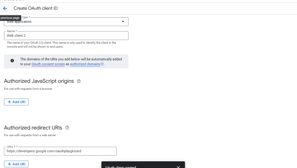 - Under Authorized redirect URIs, add a line with: https://developers.google.com/oauthplayground.