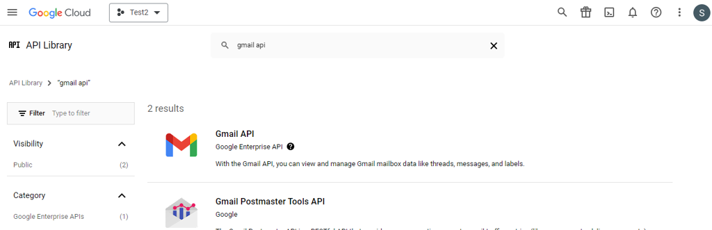 - Search for the Gmail API for mailbox access. Select Gmail API. Click on ENABLE button.