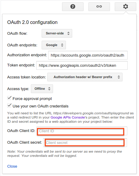 - Click the gear icon in the upper right corner and check the box labeled Use your own OAuth credentials (if it isn't already checked).