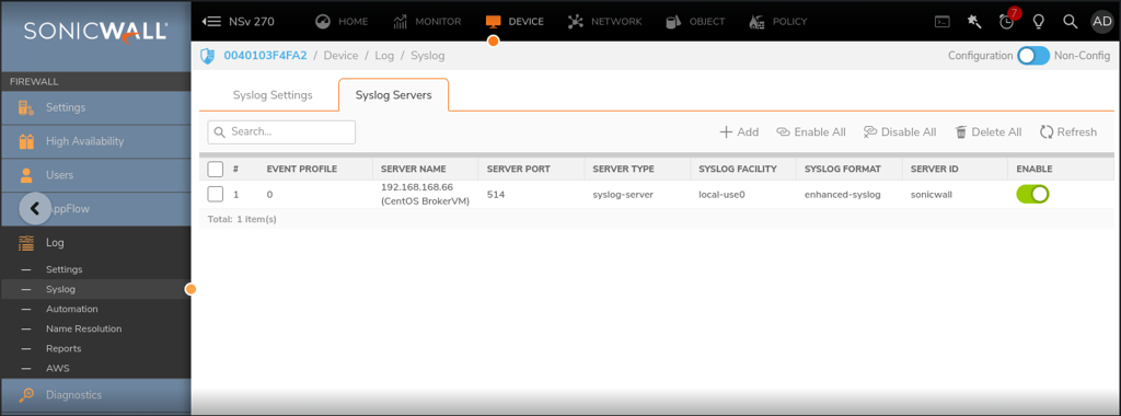 2. Go to SonicWall Web interface, navigate to Logs & Reporting | Log Settings> Syslog > Syslog Server, Add a new syslog server, set the event collector machine IP and UDP port 514 as target for syslog log forwarding. Save the changes.