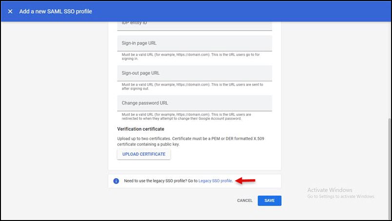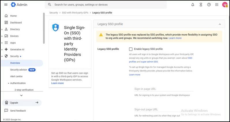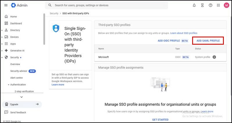 - Log into Google Admin Console and navigate to Security → Authentication → SSO with third-party-IdP.