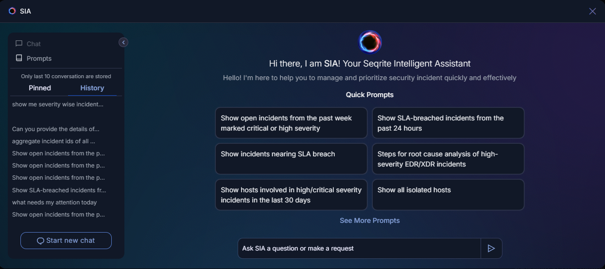 • A welcoming message: "Hi there, I am SIA! Your Seqrite Intelligent Assistant. Hello! I'm here to help you manage and prioritize security incidents quickly and effectively."