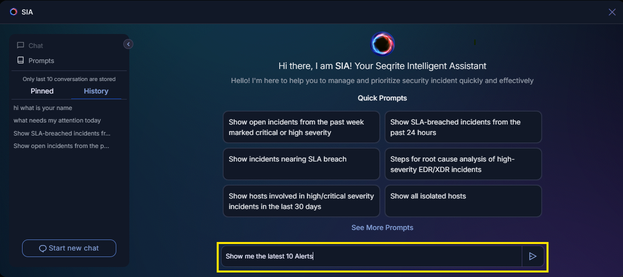 Chats in Seqrite Intelligent Assistant (SIA) are interactive conversations that allow analysts to communicate with the assistant in real-time. They serve as a dynamic and intuitive way to access information, manage incidents, and navigate the XDR environment with precision and ease. Whether you need detailed insights or quick responses, chats are the medium for seamless interaction with SIA.