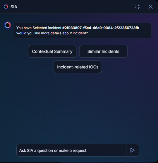 - Once opened, SIA will be ready to assist you with managing and investigating the selected incident.
